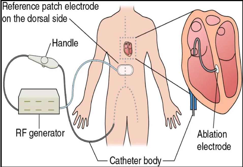 Current leaves the generator, passes through the catheter, enters the myocardium, travels through the body, and returns via the dispersive patch. The point of highest current density is the catheter-tissue interface because the surface area of the tip electrode is much smaller than the surface area of the dispersive electrode. That difference in area is exactly why useful heating occurs in the heart and not in the skin.